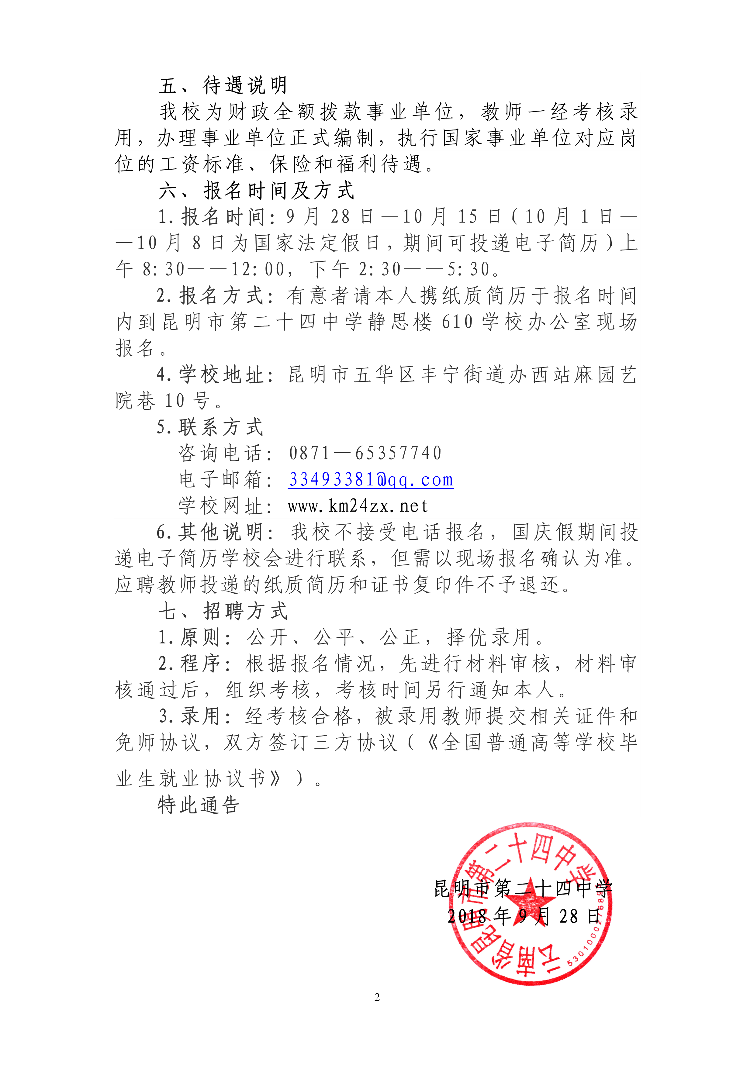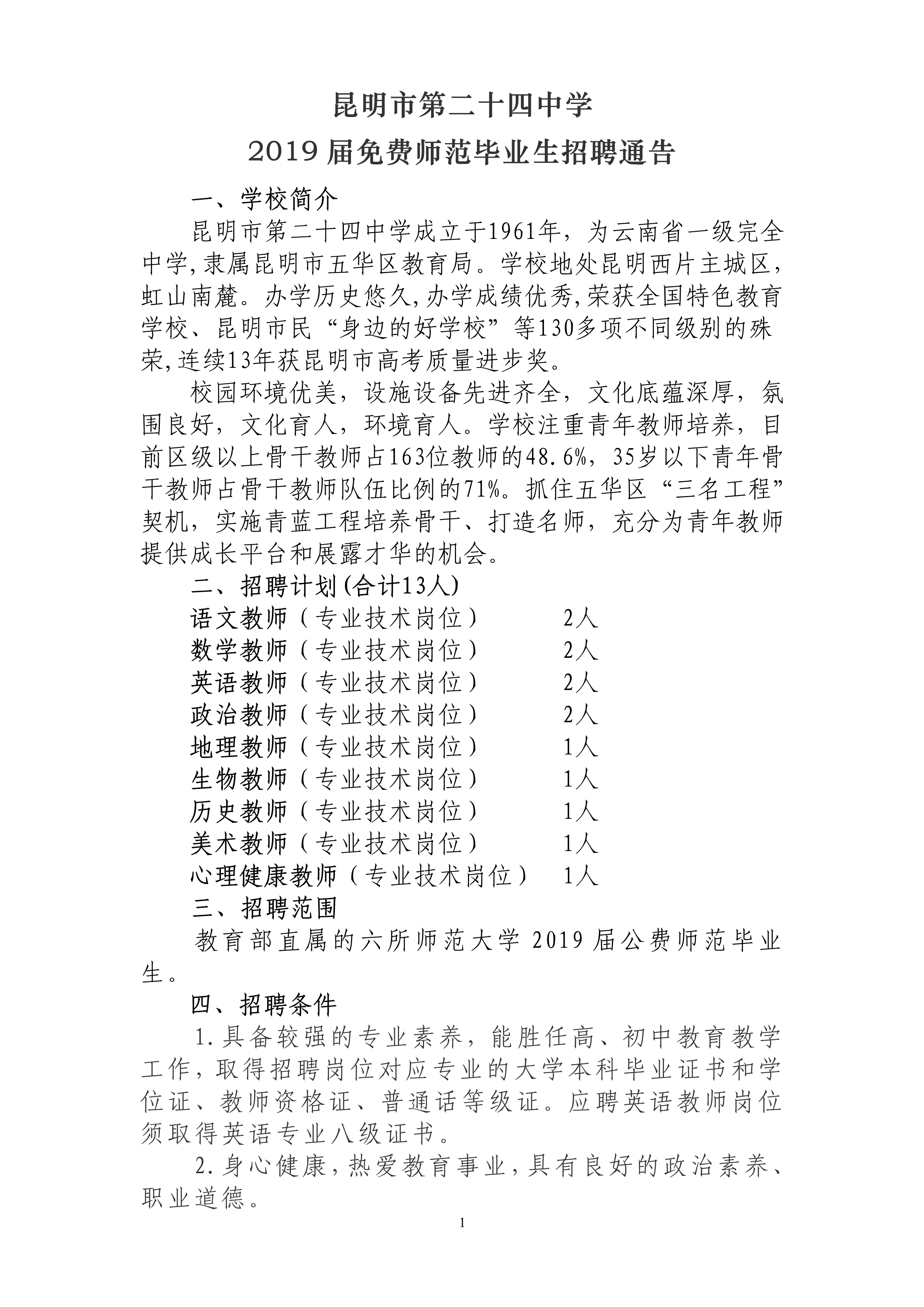 昆明市第二十四中学2019届免师招聘通告