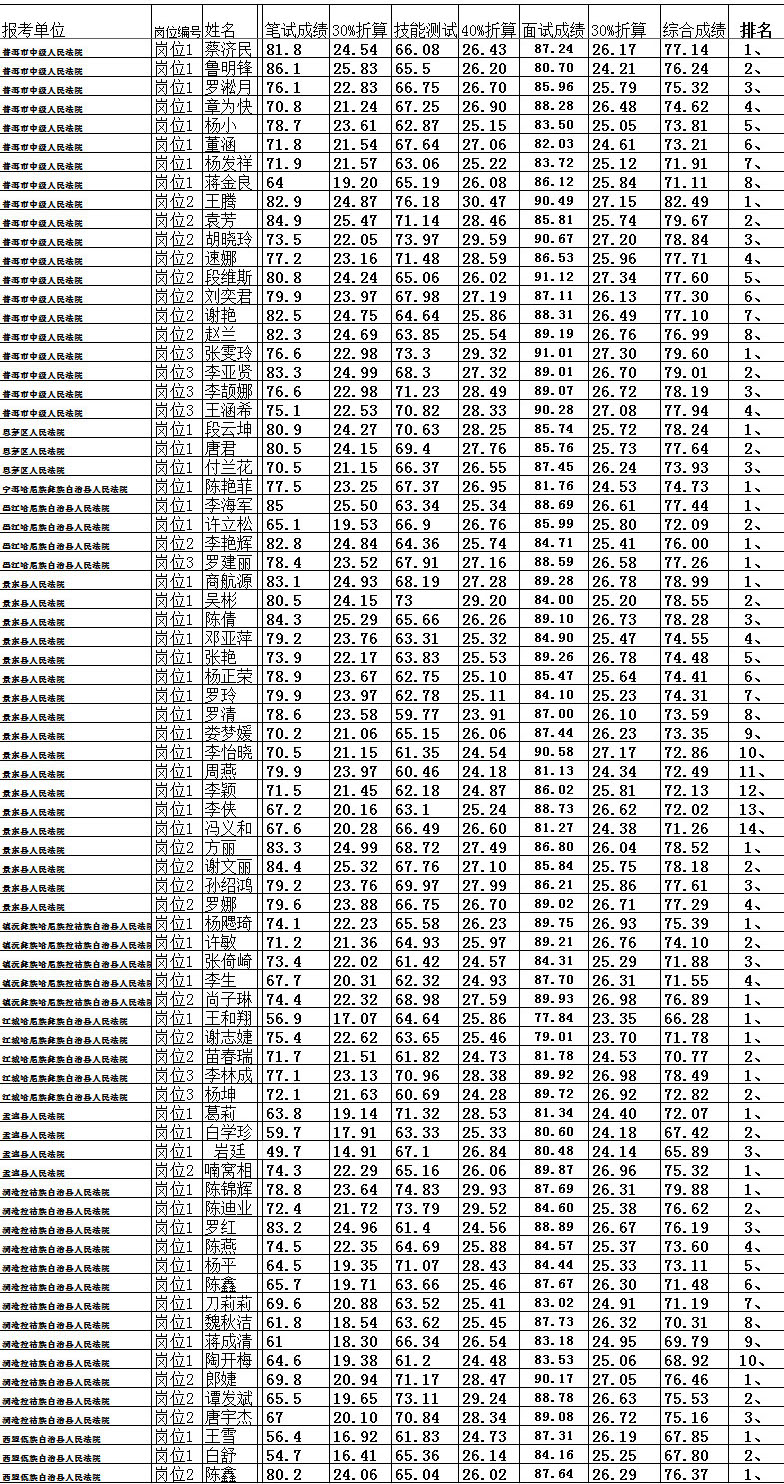 根据《云南省法院系统2018年公开招聘聘用制书记员公告》、省高院政治部《关于做好云南省法院系统2018年招聘聘用制书记员相关工作的通知》精神,2018年普洱市法院系统公开招聘聘用制书记员工作,经上报计划、网络报名、资格审核、笔试、技能测试、面试程序。按招聘岗位现将进入体检人员公告如下: