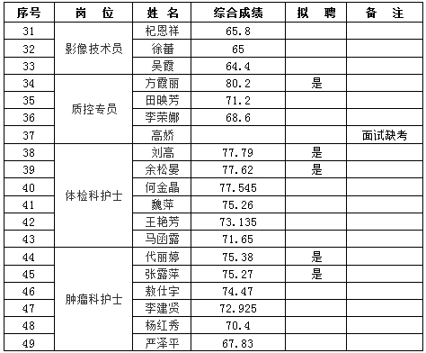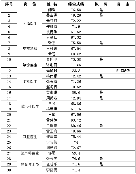根据《云南昆钢医院2019年工作人员(非事业编制)招聘启事》的相关安排,经过现场报名、资格审查、笔试、面试、体检等程序,经医院招聘人员工作领导小组办公室审批,现将综合成绩和拟聘名单公示如下: