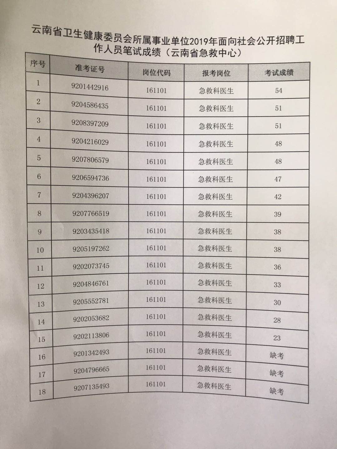 云南省卫生健康委员会所属事业单位 2019年面向社会公开招聘工作人员笔试成绩(云南省急救中心)