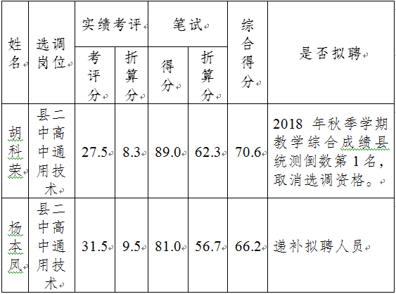 根据《麻栗坡县2019年城区学校(园)公开选调教职工公告》“近3年教学综合成绩有县、乡(镇)倒数第1名(任课教师3人及以下的除外)不得报考”之规定,经县教育体育局审核,决定取消胡科荣的选调资格,按综合成绩高低顺序递补杨本凤,现将具体情况公告如下: