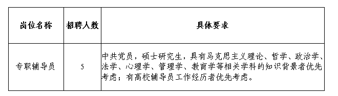 为适应学校发展的需要,2019年我校继续面向社会公开招聘专职辅导员5名,现将有关事宜公告如下: