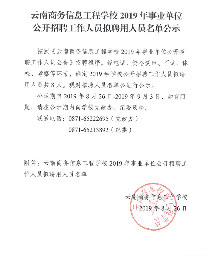 云南商务信息工程学校2019年公开招聘拟聘人员公示