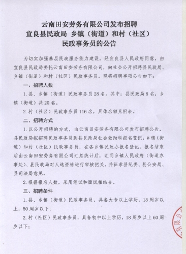 云南田安劳务有限公司发布招聘宜良县 民政局乡镇(街道)和村(社区)民政事务员的公告