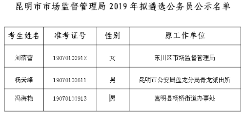昆明市市场监督管理局2019年拟遴选公务员人选公示