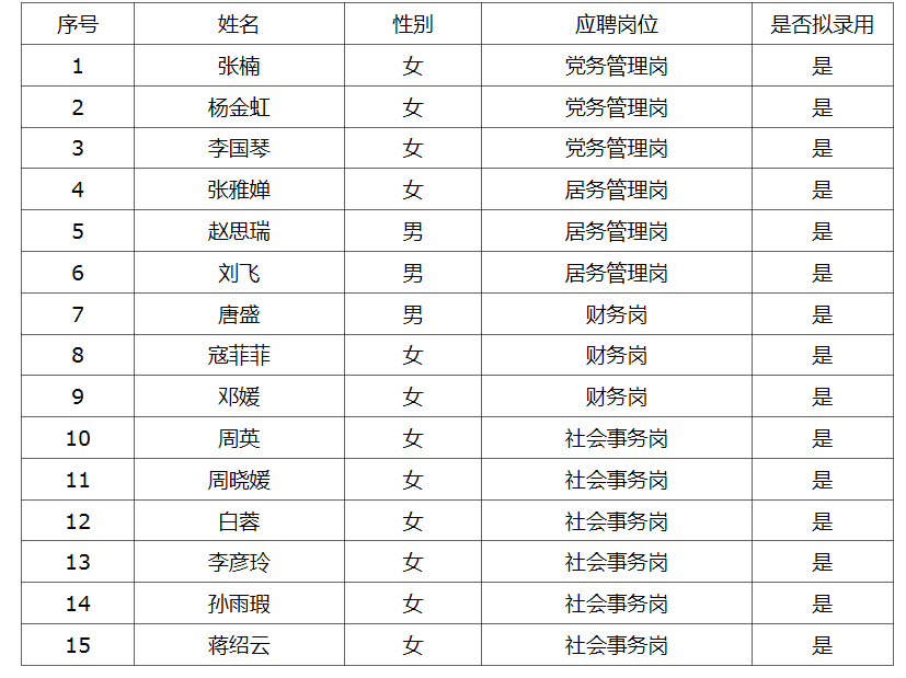 根据《阿拉街道办事处2019年公开招聘社区专职工作人员公告》要求,此次招聘笔试、面试、体检工作已结束。现将拟录用岗位及人员名单公示如下: