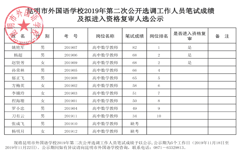 昆明市外国语学校2019年第二次选调笔试成绩及资格复审人选公示