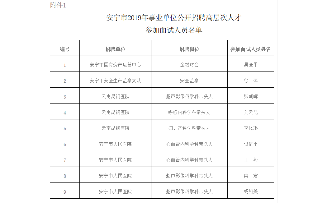 1. 安宁市2019年第二批事业单位公开招聘高层次人才参加面试人员名单