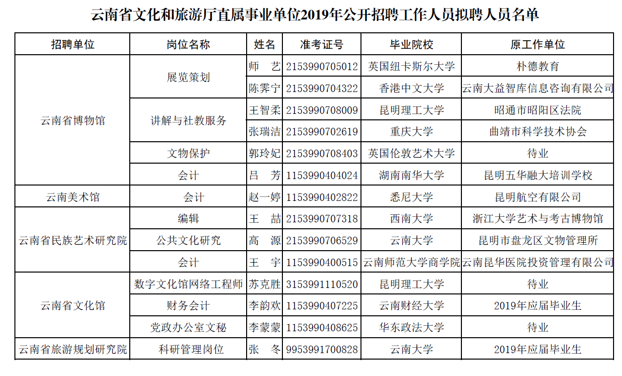 云南省文化和旅游厅直属事业单位2019年公开招聘工作人员拟聘人员公示