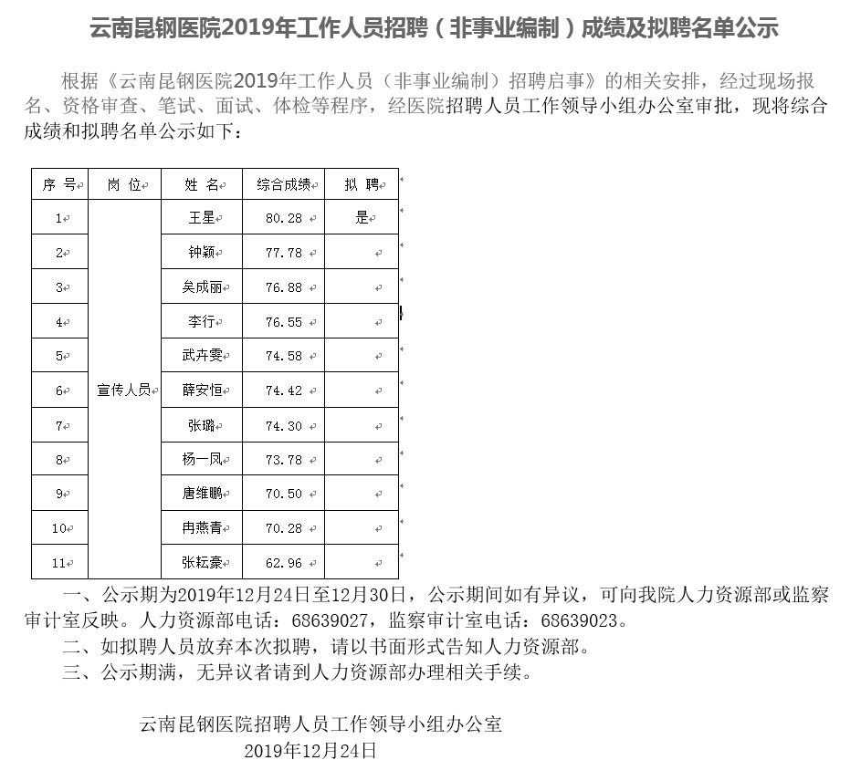 云南昆钢医院2019年工作人员招聘(非事业编制)成绩及拟聘名单公示