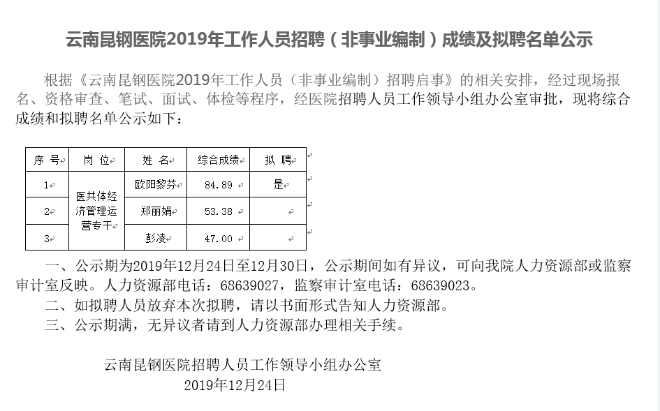 云南昆钢医院2019年工作人员招聘(非事业编制)成绩及拟聘名单公示