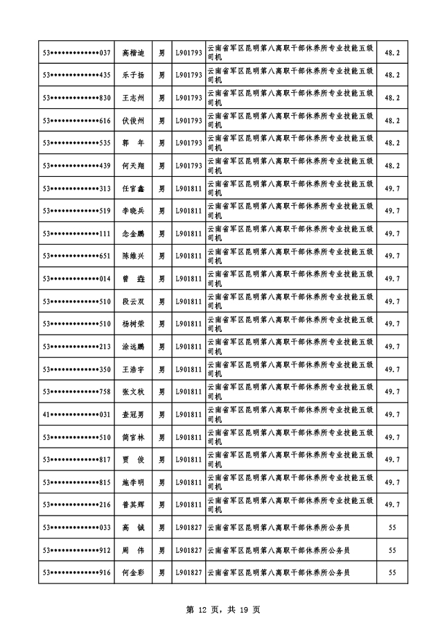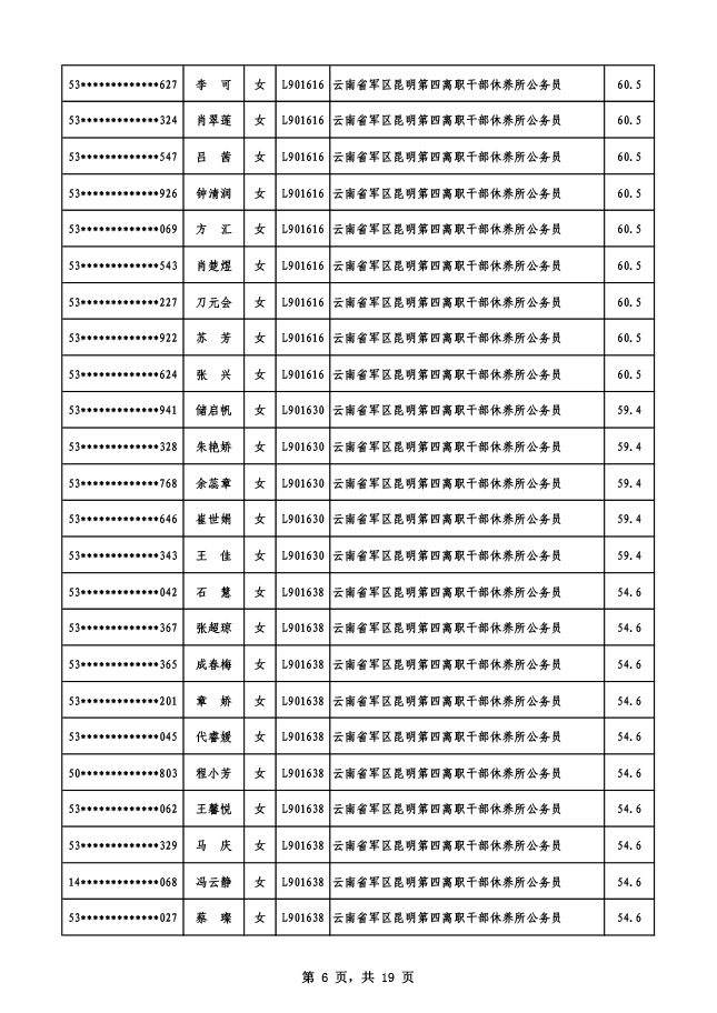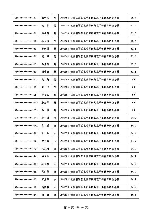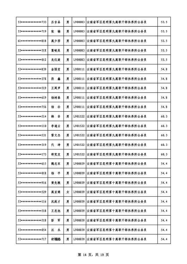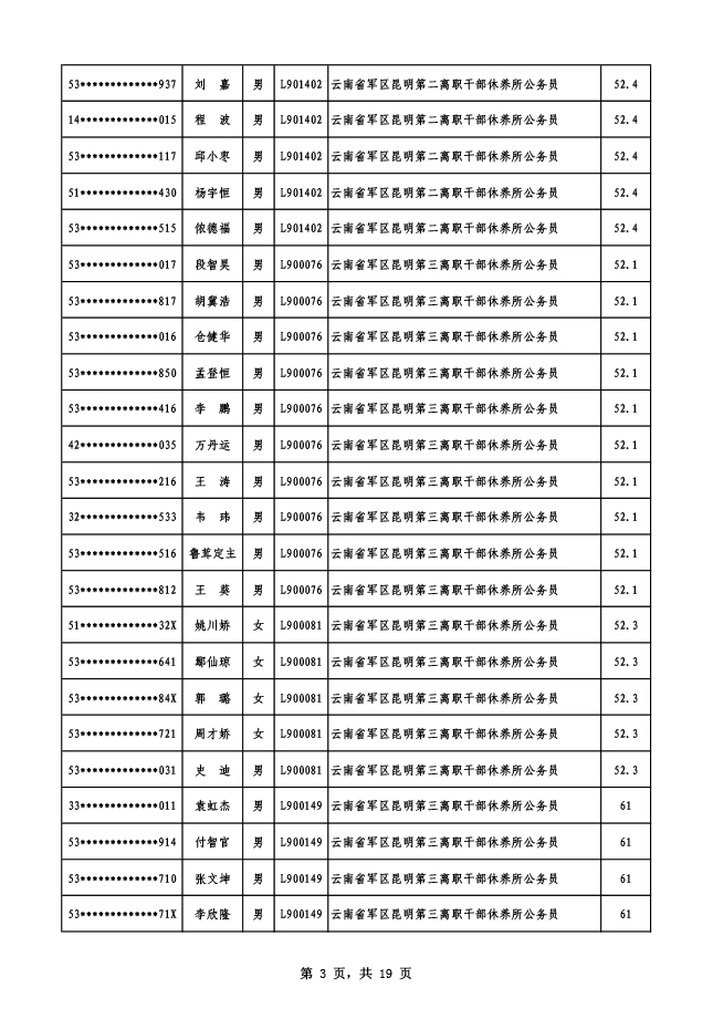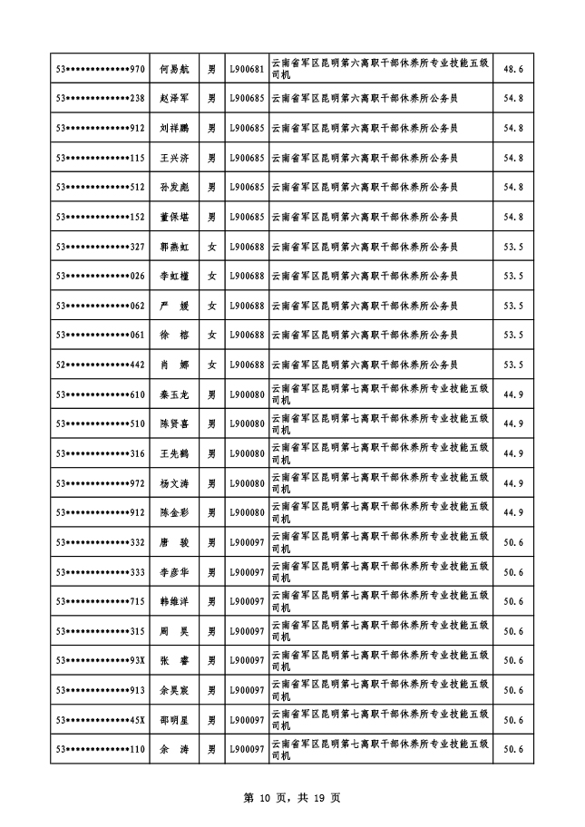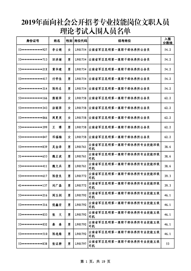2019年云南省军区面向社会公开招考专业技能岗位文职人员 理论考试入围人员名单