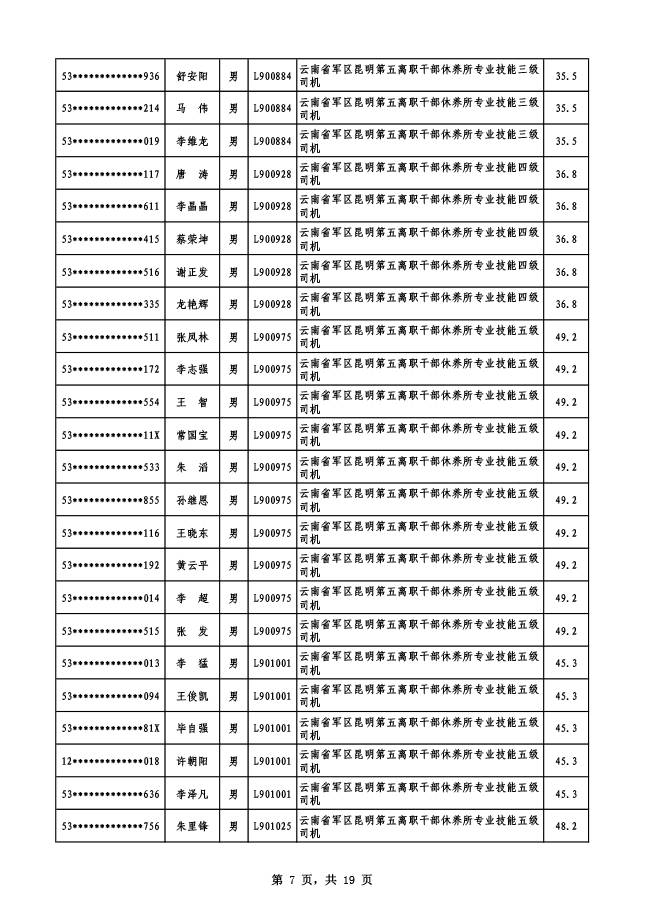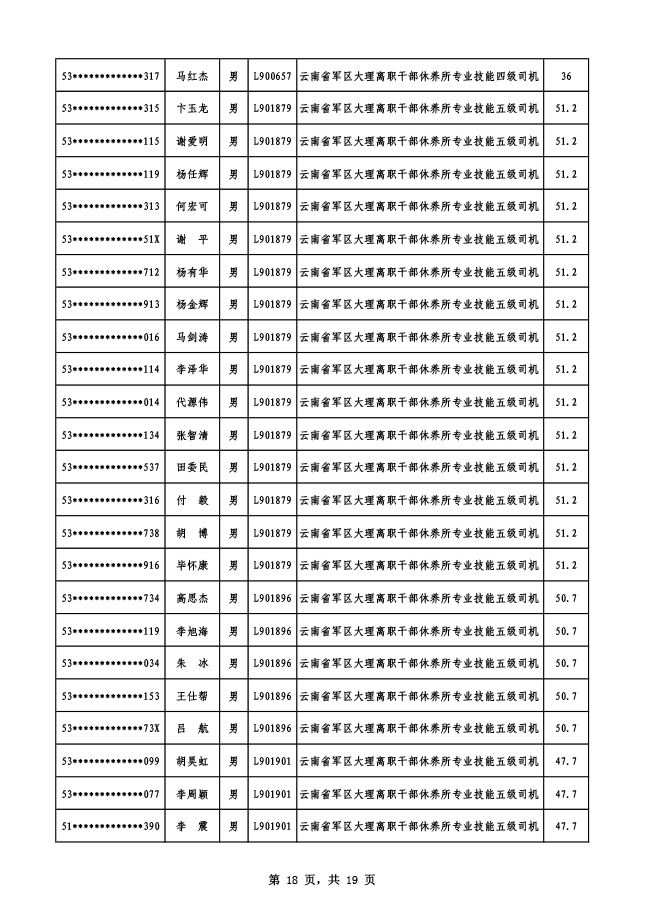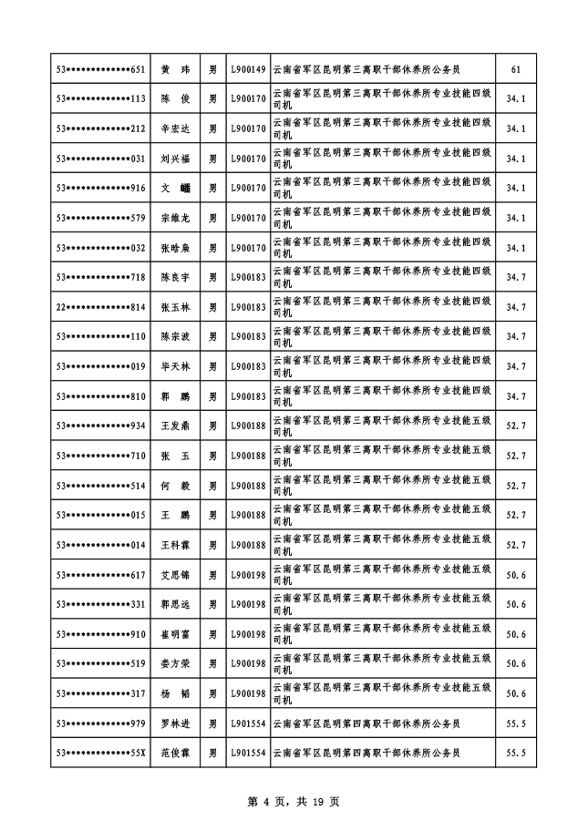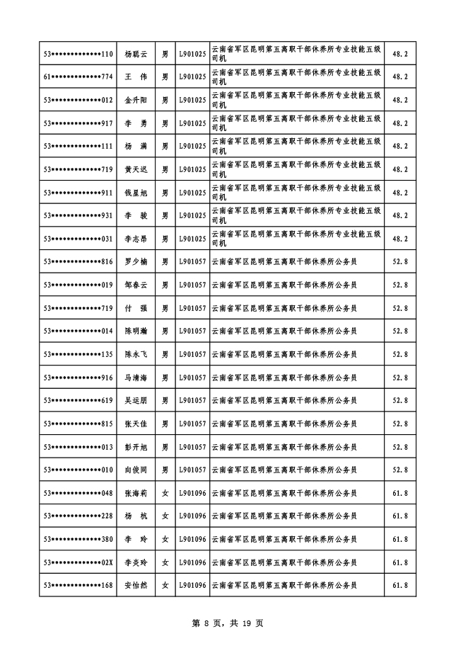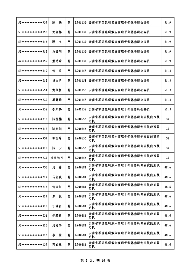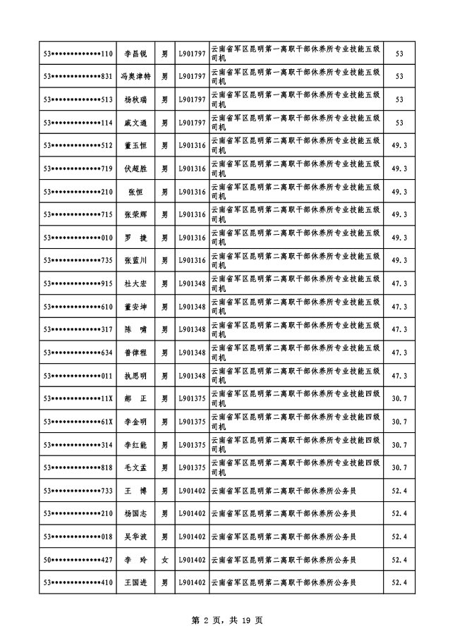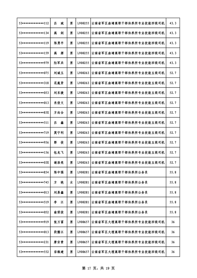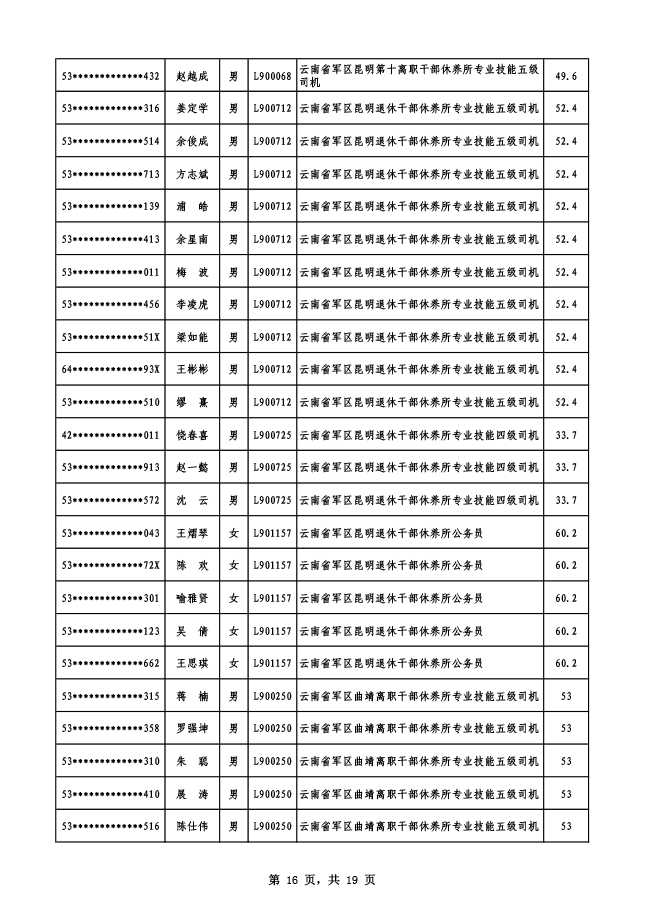 2019年云南省军区面向社会公开招考专业技能岗位文职人员 理论考试入围人员名单