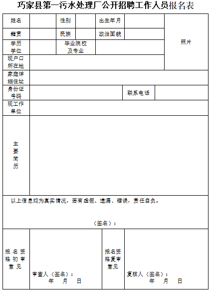 附:巧家县第一污水处理厂公开招聘工作人员报名表