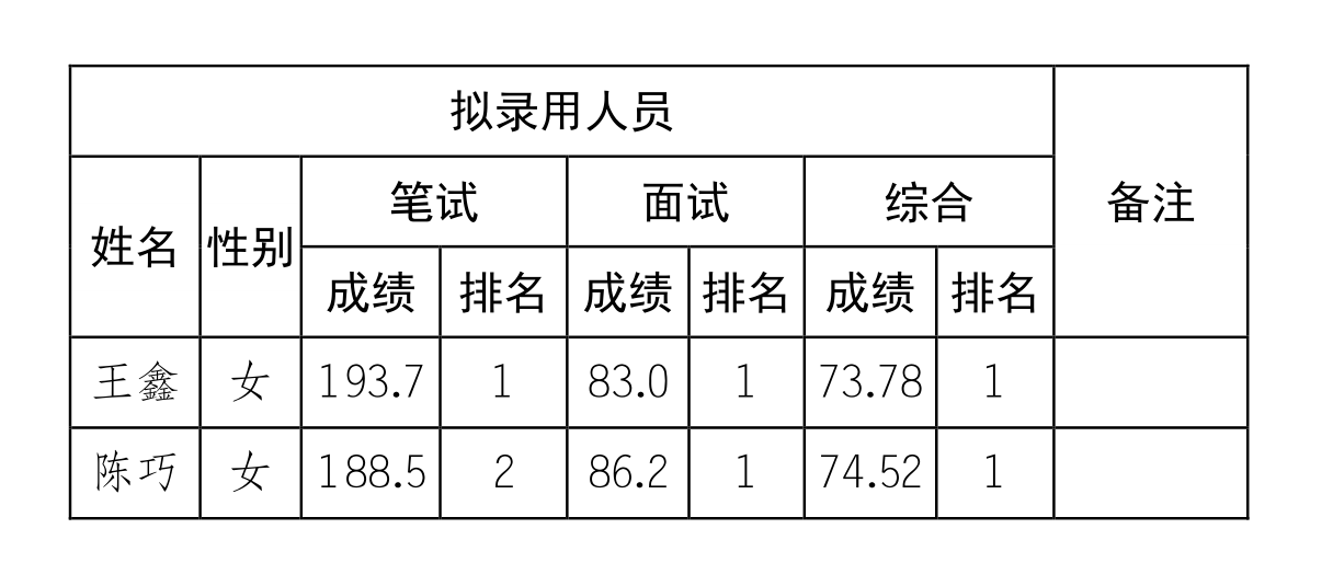 2019年云南农业职业技术学院公开招聘工作人员中,王鑫和陈巧2名考生因孕期结束后按照要求进行了体检。根据笔试、面试、考察及体检结果,按照有关规定,经研究,同意王鑫和陈巧2人为拟录用人员,并公示如下: