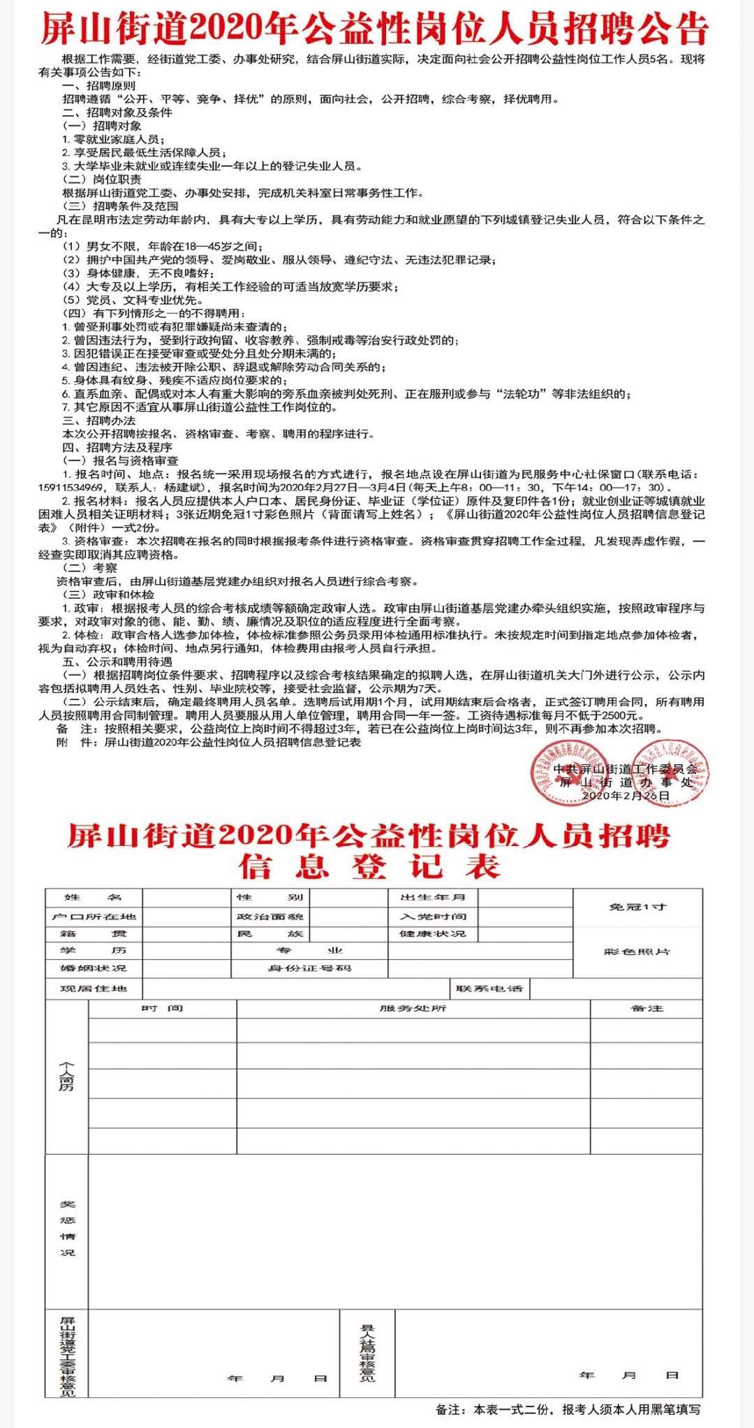 2020年昆明市禄劝县屏山街道公益性岗位招聘公告