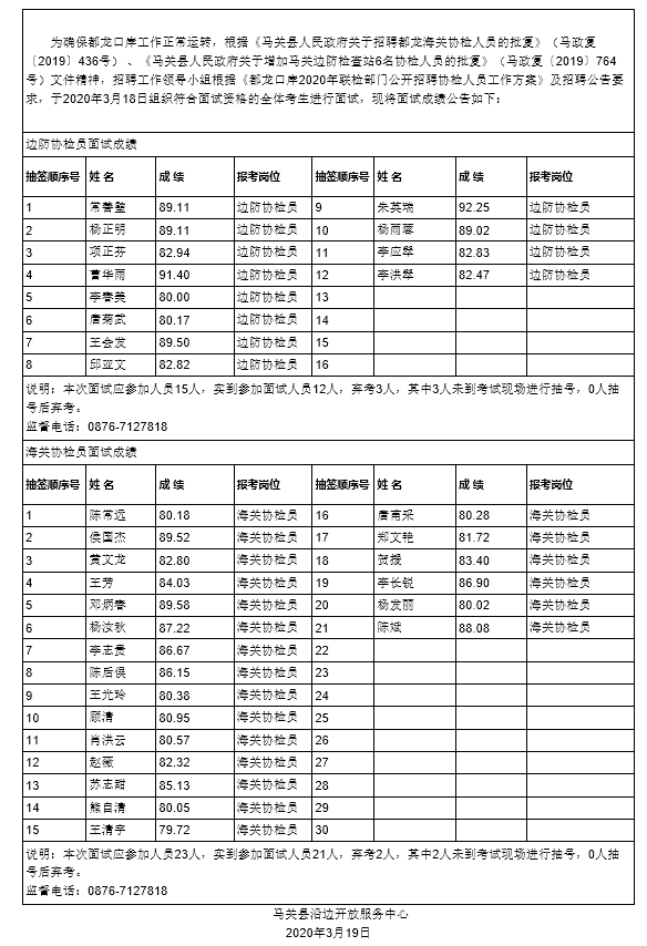 文山州马关县都龙口岸2020年联检部门招聘协检人员面试成绩公告