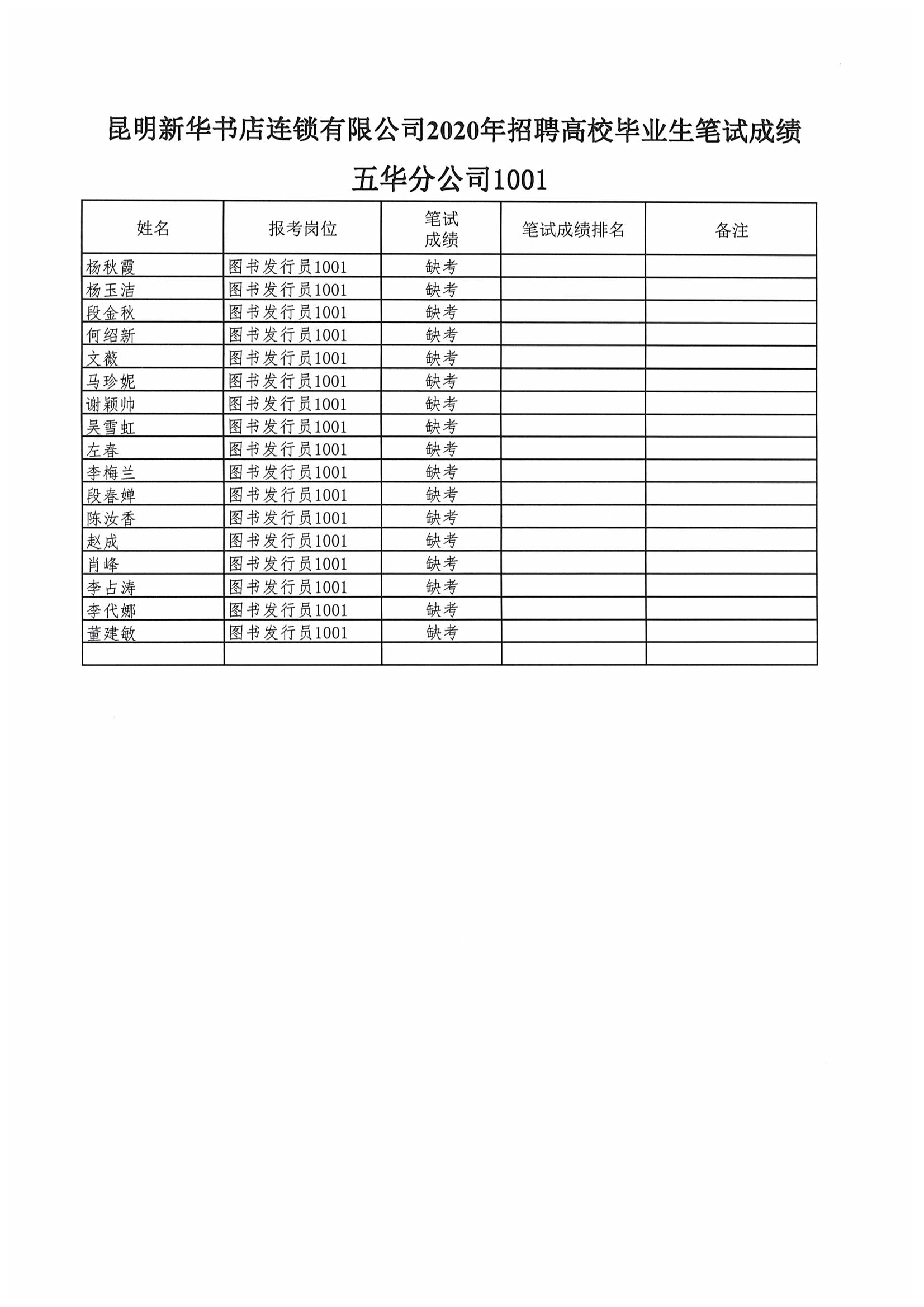 昆明新华书店连锁有限公司2020年招聘高校毕业生笔试成绩公示