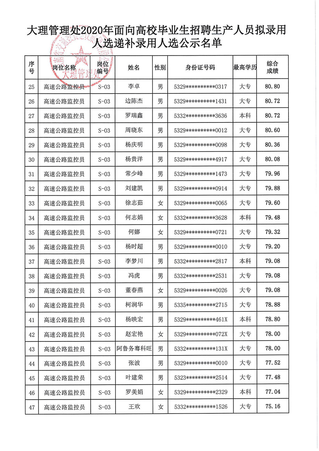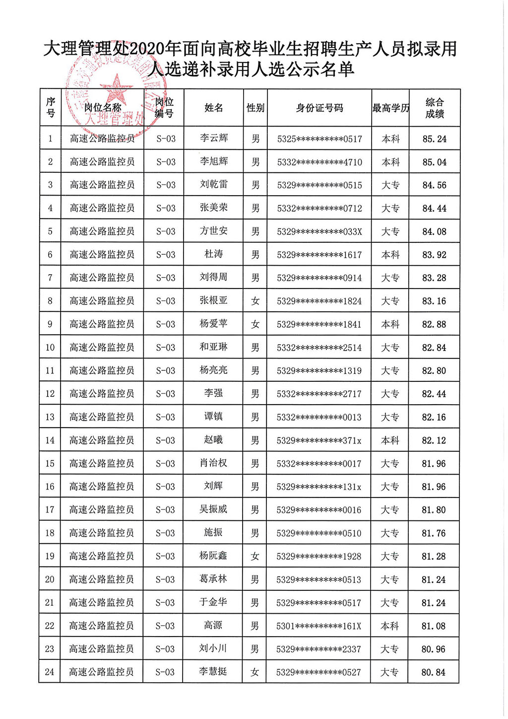 云南交投集团大理管理处2020年招聘拟录用(递补)名单公示