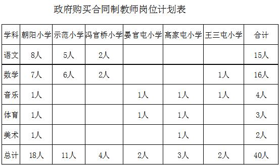 根据教育部、省教育厅和曲靖市人民政府关于全面消除大班额的有关文件精神,结合我区小学实际情况,公开招聘(编制外)政府购买合同制教师40名,经曲靖经济技术开发区社会事业局公开招聘教师领导小组研究制定本方案。现公告如下: