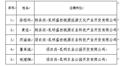 昆明农业发展投资有限公司2020年高校毕业生公开招聘笔试、面试、考察、体检等工作已结束,根据《昆明农业发展投资有限公司2020年高校毕业生公开招聘公告》有关规定,现将拟聘用人员公示如下: