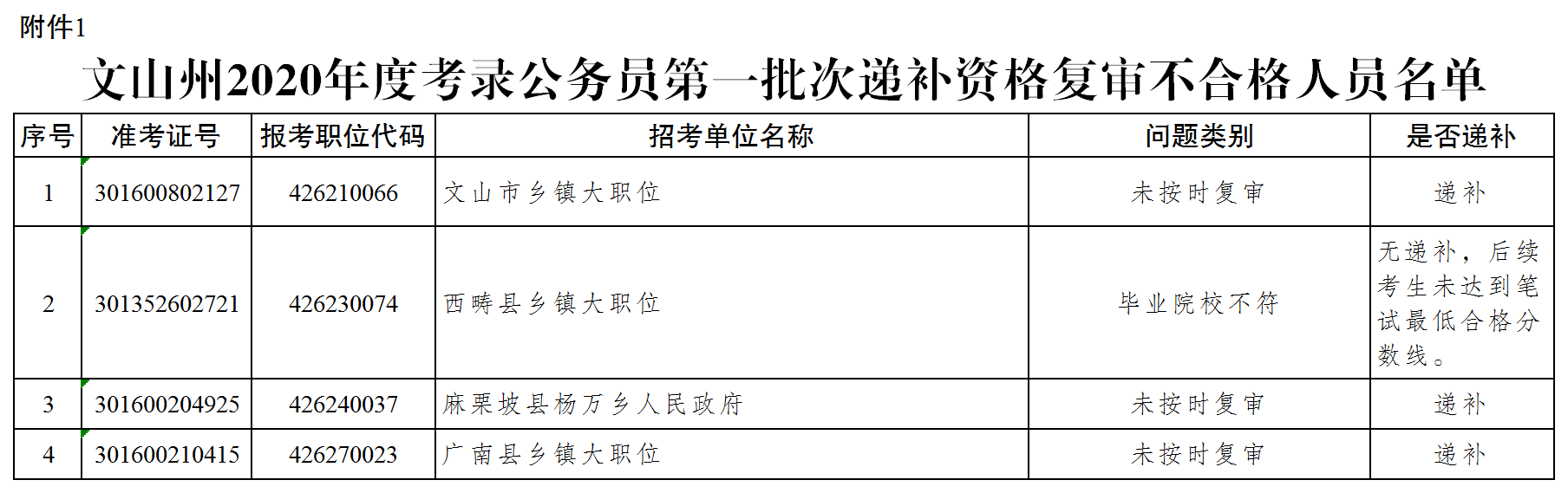 附件:1.文山州2020年度考录公务员第一批次递补资格复审不合格人员名单