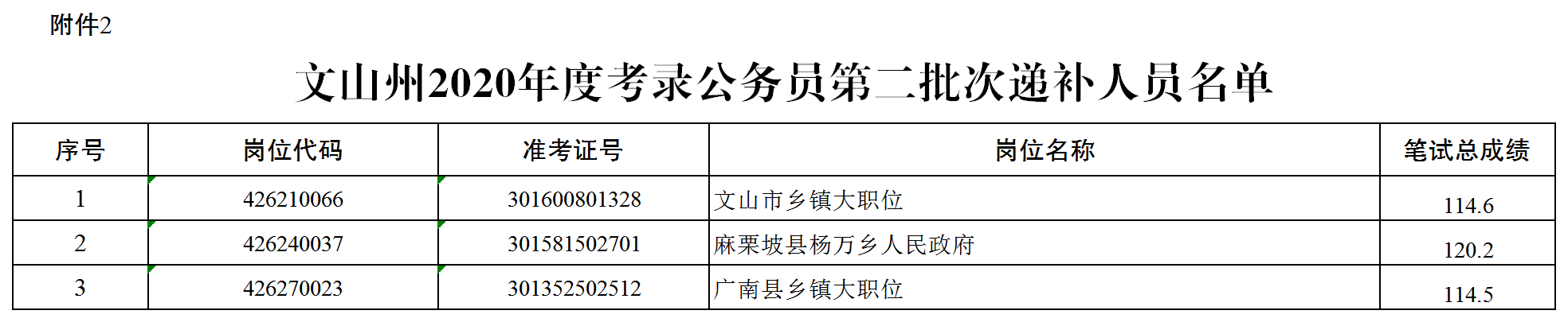 2.文山州2020年度考录公务员第二批次递补人员名单